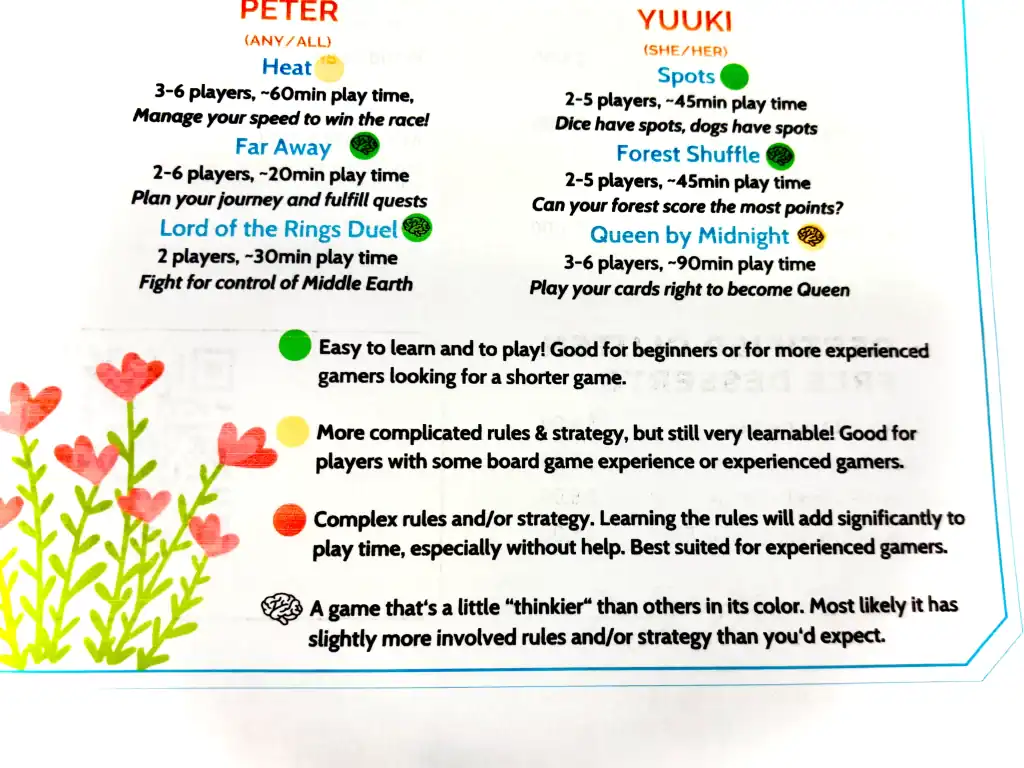 Each staff recommendation (like the ones from Peter and Yuuki above) also includes player counts, estimated play time, and a brief theme summary, making it easy for guests to browse with confidence.